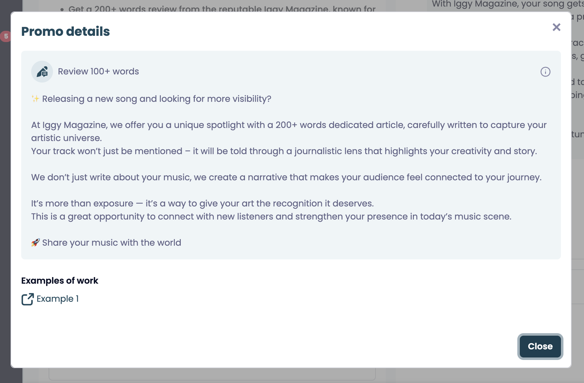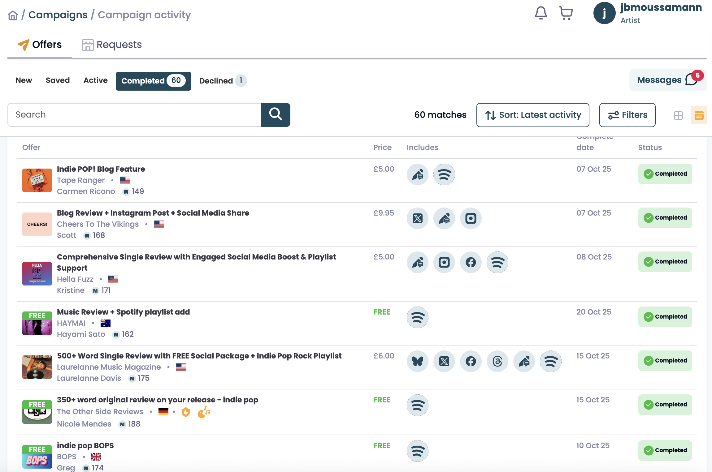Then once it has been accepted, you can start expecting to see ‘offers’ come in. These are pitches from various music blogs, offering to write a review on your music for various fees. These individual fees range from as little as £3 to £25 and more.
